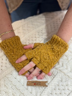 Lovingly hand-knitted with great care by one of our highly skilled knitters. Our handknit Aran finger-less gloves provide perfect insulation from the chilly outdoors while still allowing wearer to browse a phone or ipad with ease
